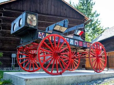 The artwork is located outside of the Log Barn on the grounds of Pickering Museum Village.